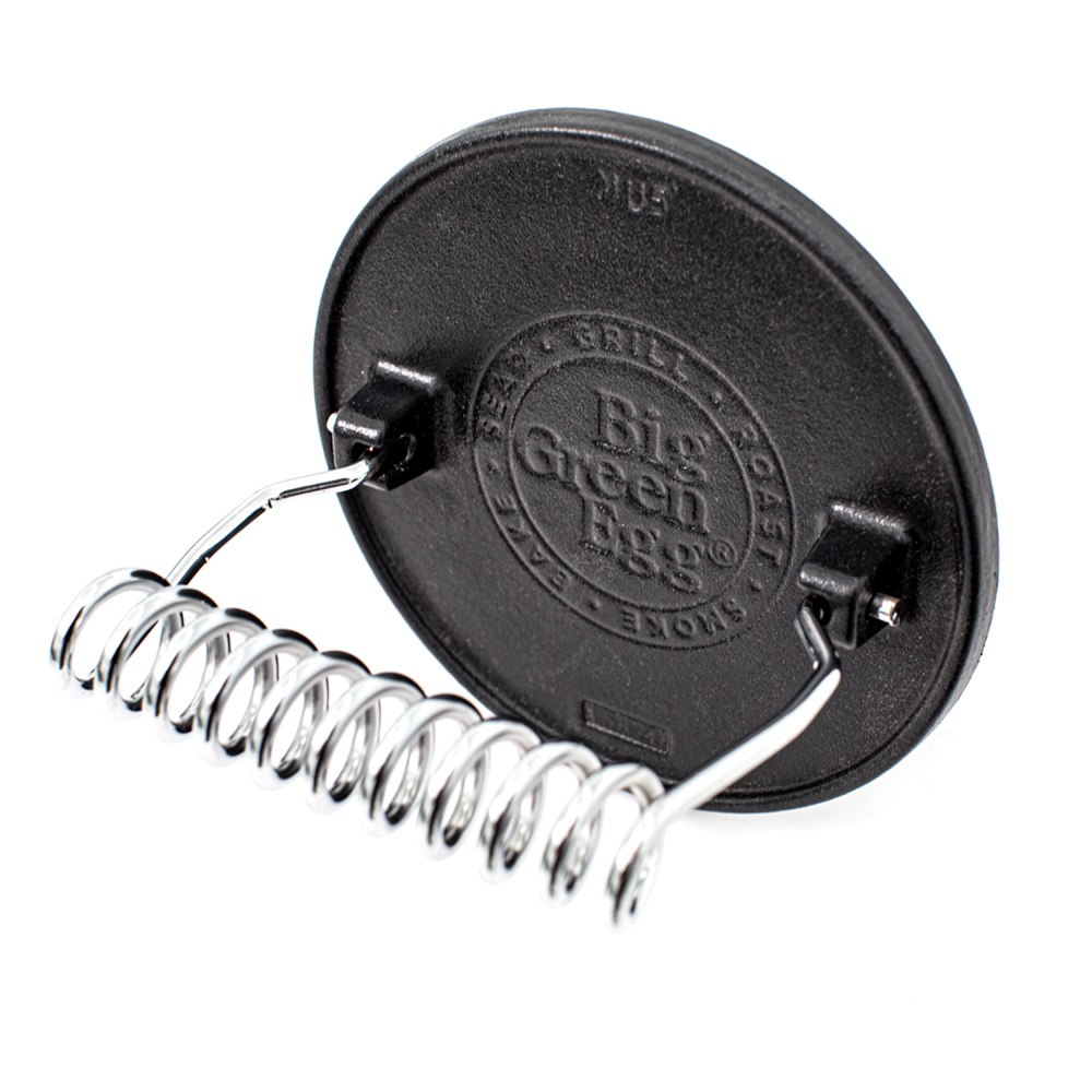 The NEW Big Green Egg Cast Iron Grill Press creates perfect “smash” burgers with crispy edges and a juicy centre, and prevents curling when cooking bacon or ham. The Grill Press will also help you achieve those perfect sear marks when grilling steaks and seafood, and is a great tool for creating paninis and other pressed sandwiches.
