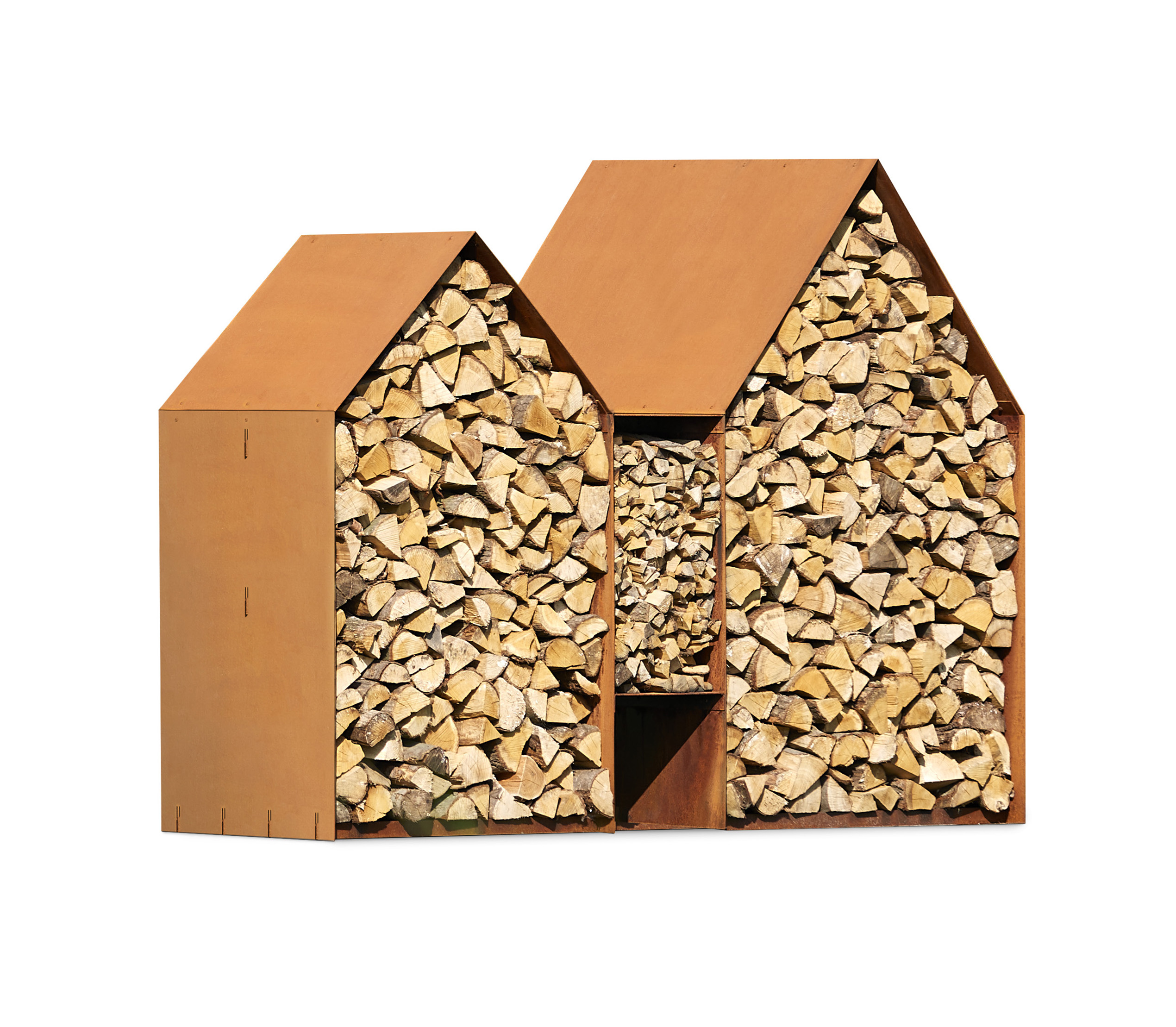 ‘Bruges’ is a wood storage made from CorTen steel. Designed by the Belgian designer Jan Kuppers (Kuppers & Wuytens). The shape is inspired by the typical Belgian façade construction. When designing a simple production and assembly was central to the design. The basic package consists of 11 metal plates, so that they can be transported as a flatpack. The parts are easy to assemble; the roof is put into shape with a few bolts, the houses themselves get the necessary stability by sliding them together with connecting pieces, for which simple slots are provided in the sheet material.