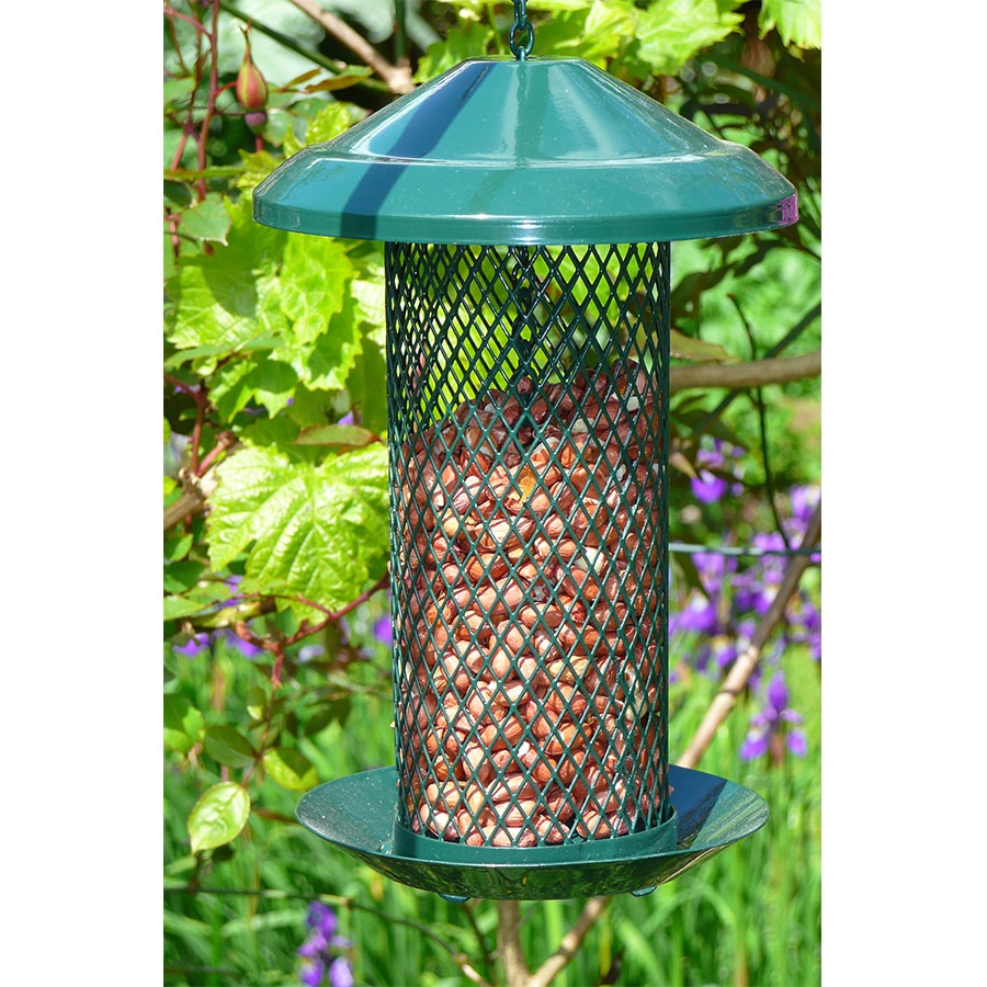 The original diamond Feeder has a wide roof for maximum weather protection a domed base with drainage and comes complete with integral tray, which prevents waste and provides a landing platform. The chain can also be hooked into itself to prevent squirrels lifting the lid.