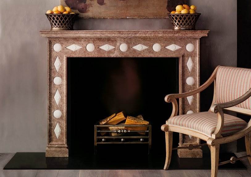 The Veneto re-works a classic Regency design in a truly original manner with a traditional frame fabricated in Light Emperador marble and comprising plain panels ornamented with repeating convex orbs and diamond shapes in contrasting Portuguese stone to create a dramatic and arresting effect.