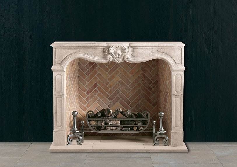 A serpentine fronted chimneypiece of the Louis XV period with carved central cartouche. Shown in Italian Bianco Avorio limestone.