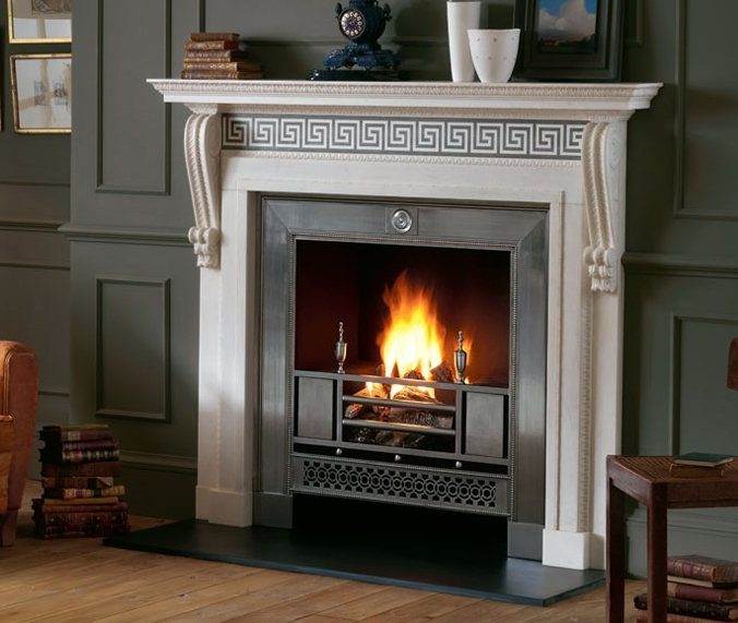 A handsome Georgian chimneypiece that displays the popular 18th century device of inlaying a contrasting marble within a statuary marble field. It has a carved corniced mantel shelf above a ?running? frieze with a Greek Key Azul Valverde inlay and jambs that terminate in delicately carved consoles.