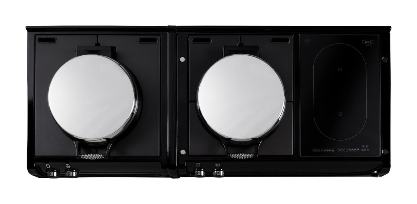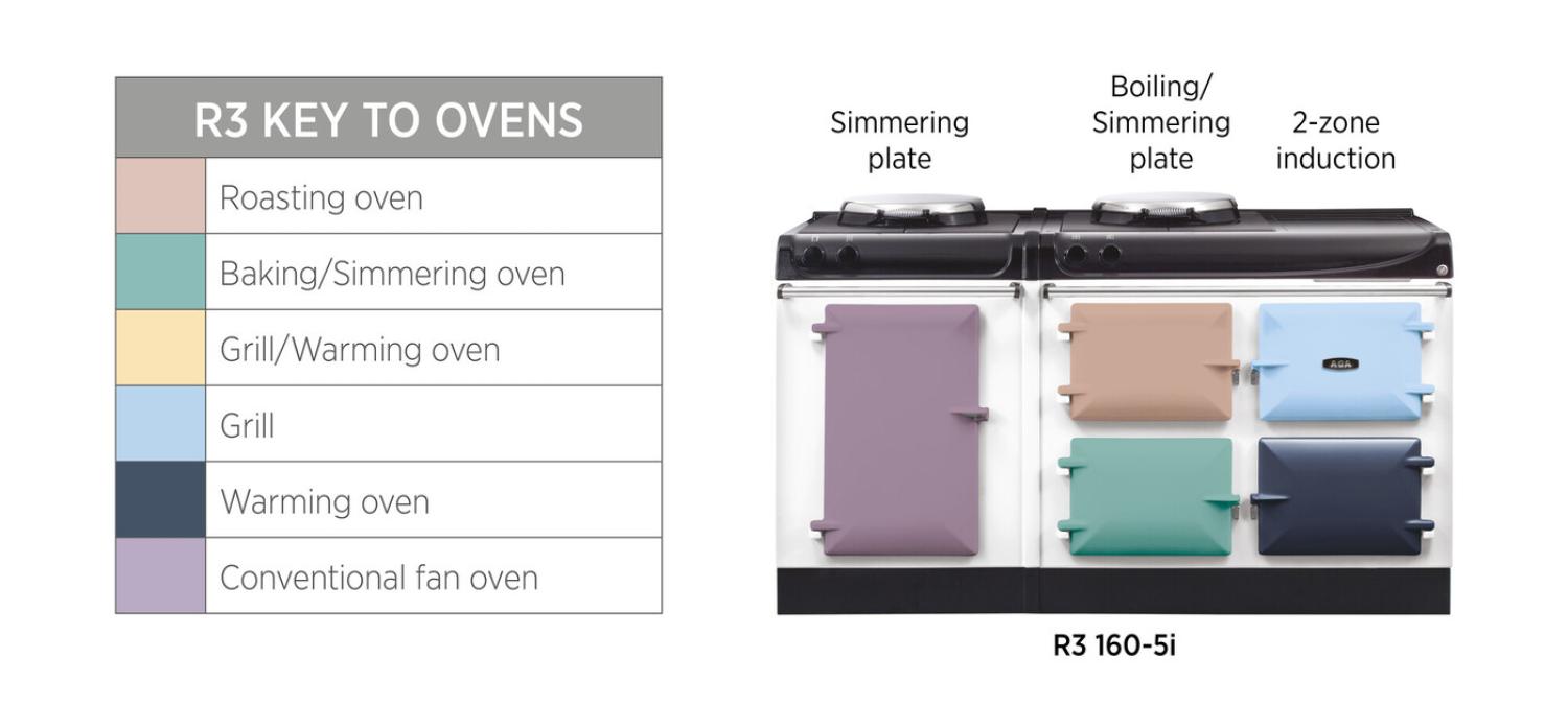 The AGA R3 Series 160 features a cast-iron heat storage roasting oven, an enamelled baking/simmering oven as well as a warming oven and an integrated, infrared grill. This model also features an iconic AGA hotplate, which can be used for boiling or simmering, and a state-of-the-art two-zone induction hob.