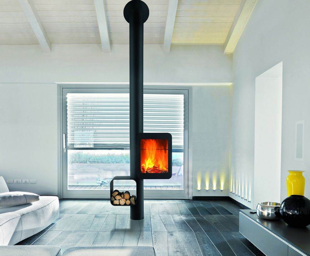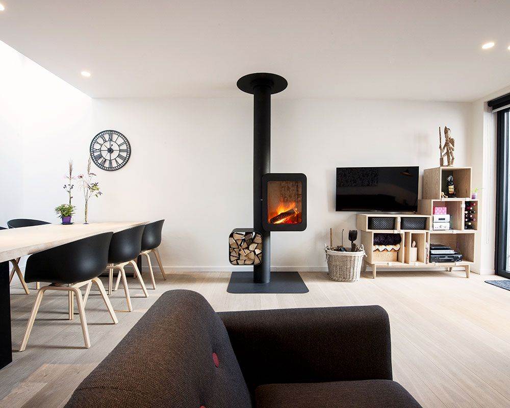 Grappus is more than a wood stove: it is a composition that rhythmically structures space, giving the fire the high note. The height of the hearth, counterbalanced by the offset wood rack, makes the stove easy to use and adapts well to any space. Grappus successfully cross-fertilises a high-performance stove, a contemporary design that reveals the flames in all their splendour, and an easily accessible wood rack.