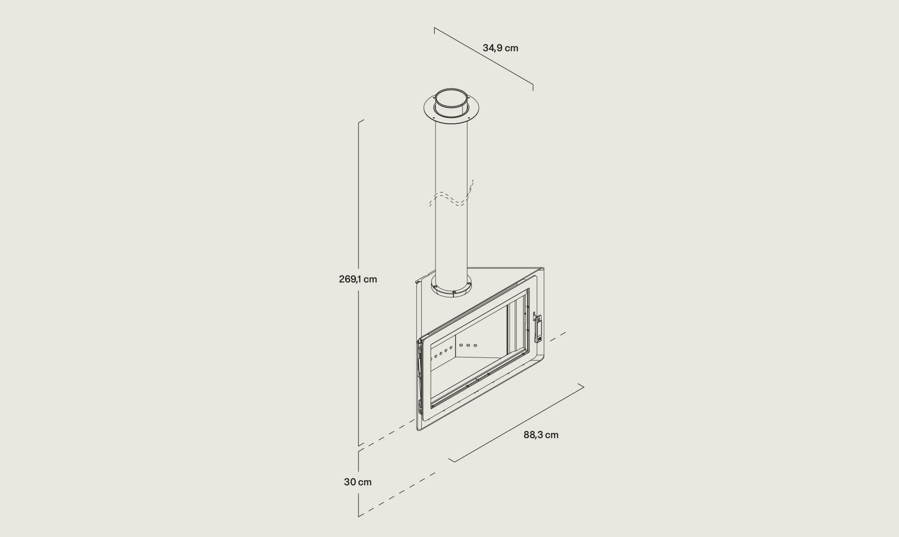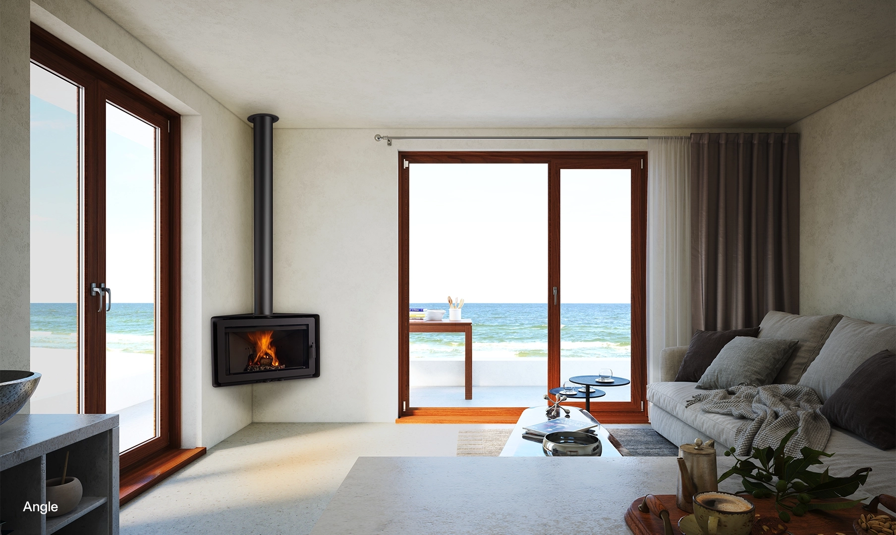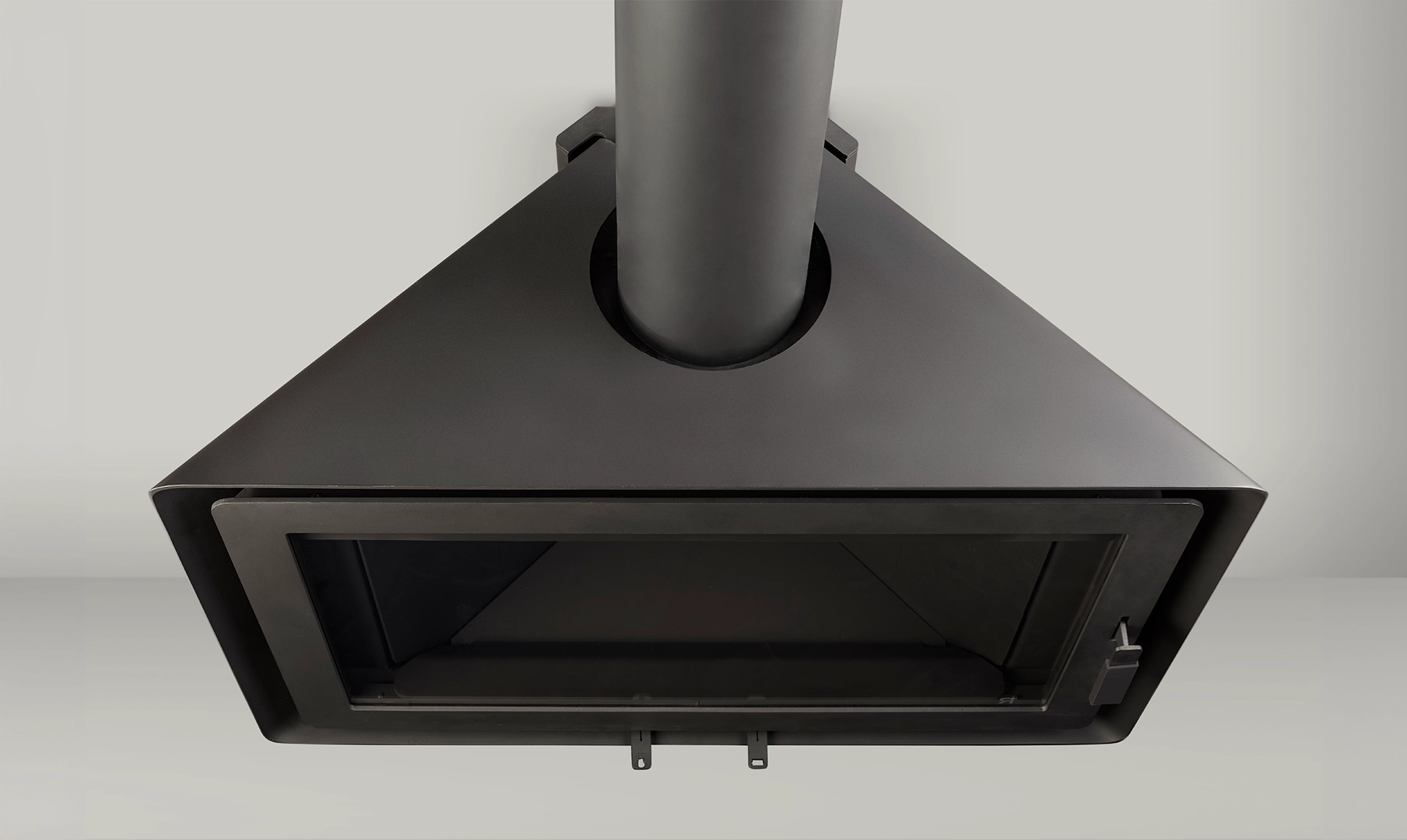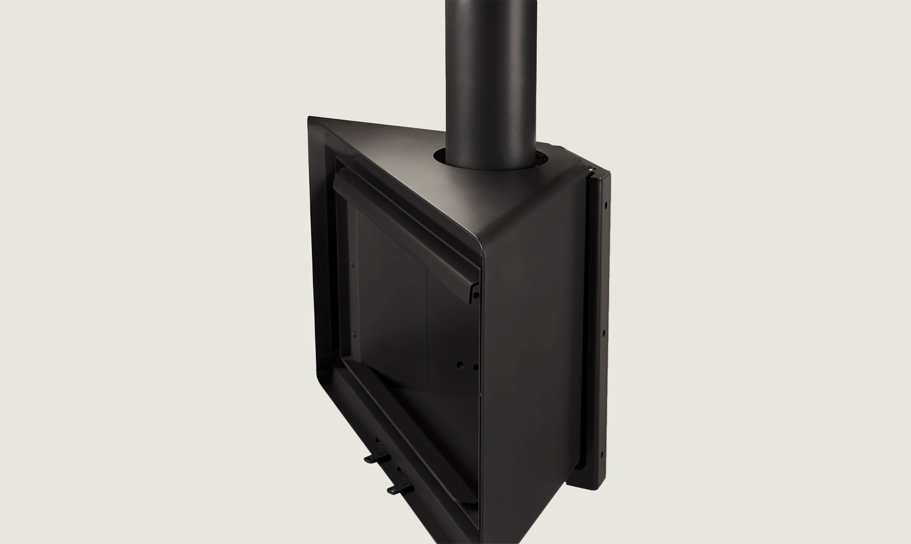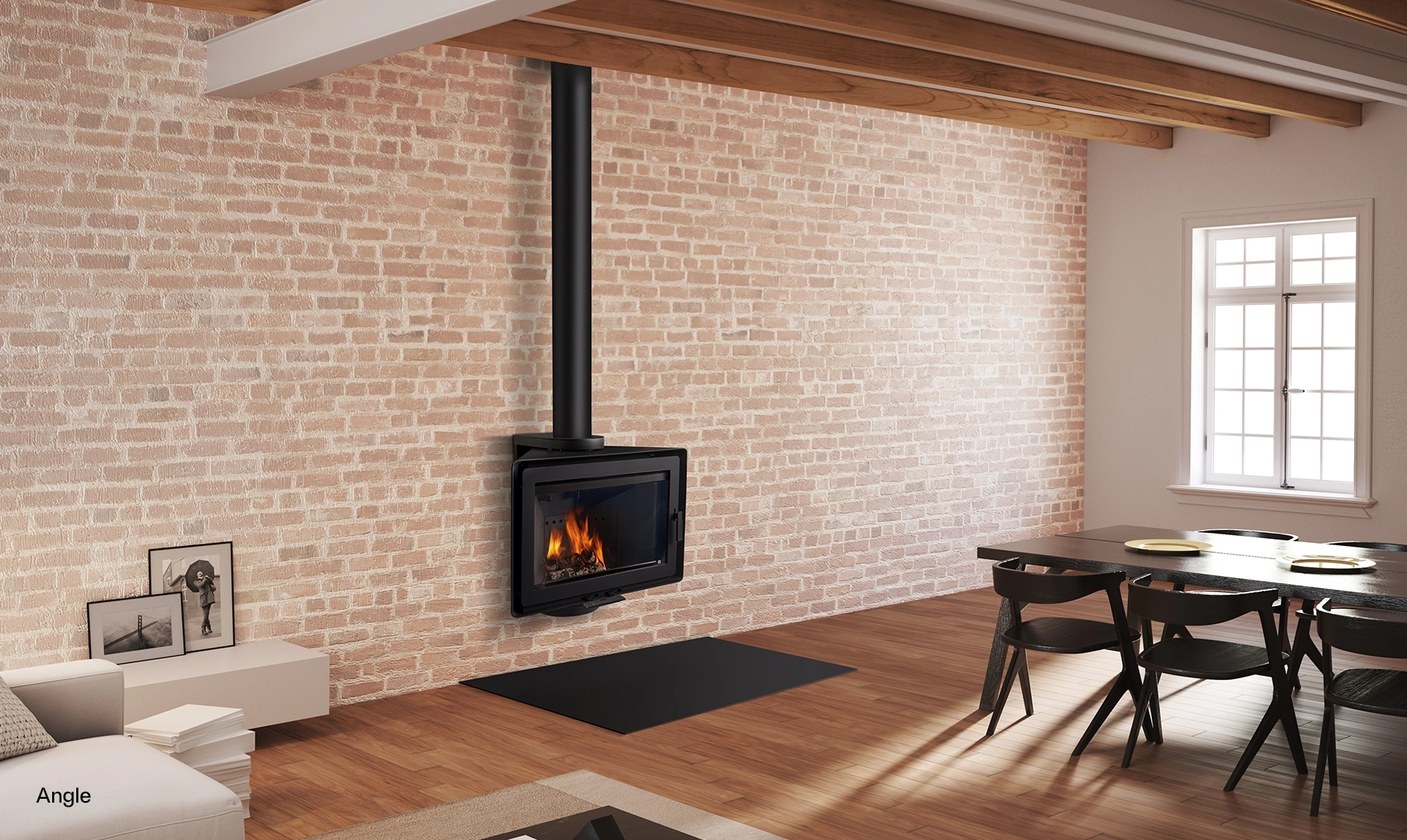 The Angle is a model that can be installed in a corner or on a front wall. Its panoramic door allows for admiring its efficient combustion and controlling the fire with precision, thanks to its front registers.